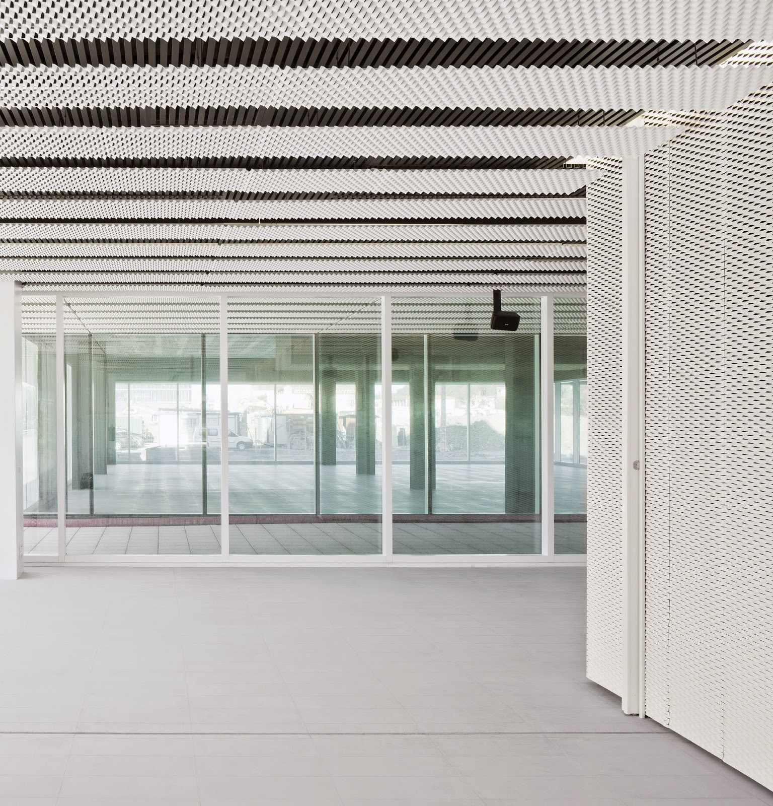 The unknown factor in terms of the number, type and nature of businesses that will occupy the building is reflected in the façade of the upper floors, forming an abstract volume which in turn enhances the concepts applied to the ground floor. The main façades on the north and south are composed of a double skin, consisting of a curtain wall on the inner face, and on the outer face, an expanded metal skin with a gateway for immediate maintenance. The expanded metal skin fulfils the functions of both solar protection and visual control of the proximity of the neighbouring buildings. The result is a building which is very bright in its interior despite the large expanse of expanded metal. The east and west façades are resolved with large vertical louvres that prevent direct solar radiation in the morning and evening.