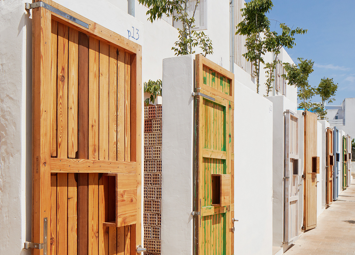 El otro, orientado norte-sur, con fachada a la calle Sant Ferran, contiene seis viviendas, 3 en planta baja y 3 en planta piso, y disponen de un dormitorio y un patio orientados a sur. Un porche a norte con una persiana de lamas verticales pintadas de color azul Formentera establece el filtro visual durante el verano y permite ventilar. En invierno, cuando la isla se vacía, las puertas se abren de par en par y el estar disfruta de ambas orientaciones.