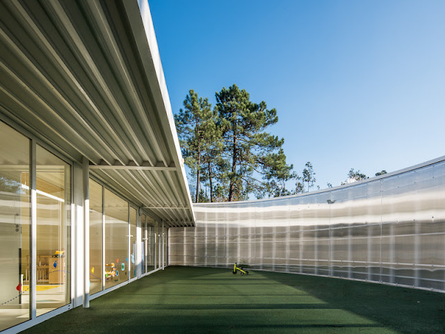 La nueva Escuela Infantil de Mos se define a través de una geometría circular perfecta que envuelve a la totalidad de usos. La cubierta fragmentada define franjas de luz longitudinales en dirección norte-sur, favoreciendo la entrada de luz natural a todos los espacios interiores.